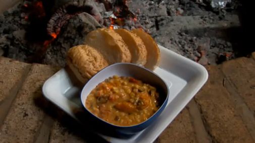 Cut the top off pumpkin (keep it for the lid!) and clean out the seeds etc. Put in vegies and soup mix, put lid back on and wrap in foil. Put into the hot coals for 1-2 hours. Serve with bread. Its delicious!